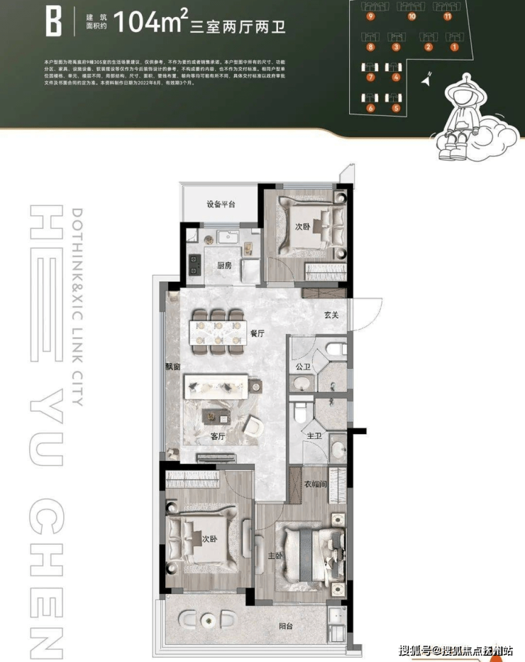 而建面约104㎡户型,同样是三房两厅两卫,侧翼单边的优渥位置让它有了更多的可能性。三面270°全景视野,全明采光,居住舒适度高。
