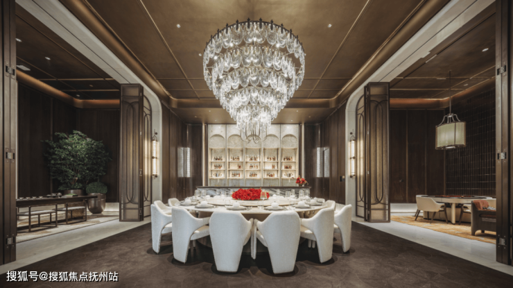 奢享私宴厅,内设巨形艺术水晶吊灯, 还有由整块香格里拉绿奢石一体打磨而成的吧台、白水晶奢石酒架、全景开放式落地窗……优雅格调跃然呈现。女王茶室可对外全部打开,宛若置身绿意和流水中,是闺蜜品茗小憩、私密洽谈的理想私属领地。