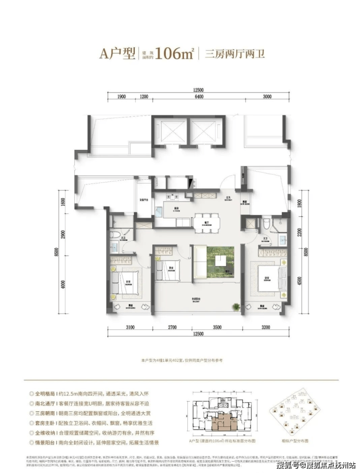 109方户型:三房两厅两卫,独立玄关,横厅边套,生活阳台+休闲阳台(全包),近13米采光