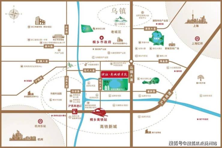 滨江·南城明月苑售楼处电话:400-1067-167项目位于乌镇大道与现代大道城市双主轴, 可通达桐乡各个区域,市政交通便利;距离高铁站约2公里处,乘坐沪杭高铁,从桐乡到杭州火车东站高铁仅 17 分钟,到上海虹桥站高铁也仅需40分钟;而且沪杭高速路口离项目仅约3公里,开车也可快速可抵达杭州、上海。
