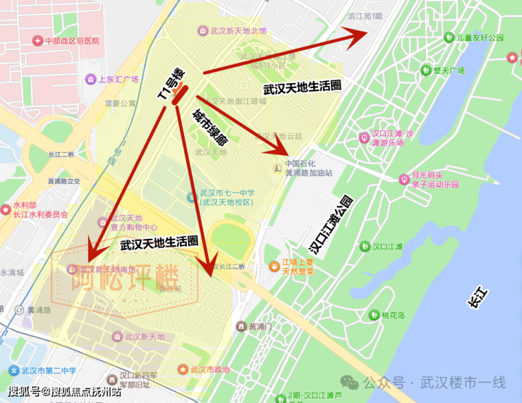 它的东南向即是延绵到汉口江滩的城市绿廊,西边即高低错落的社区中央园林,北向即市政公园(部分在建),毫不夸张的说,T1号楼东、西、北几乎被绿色环抱,在城市核心享真正的低密、松弛生活。