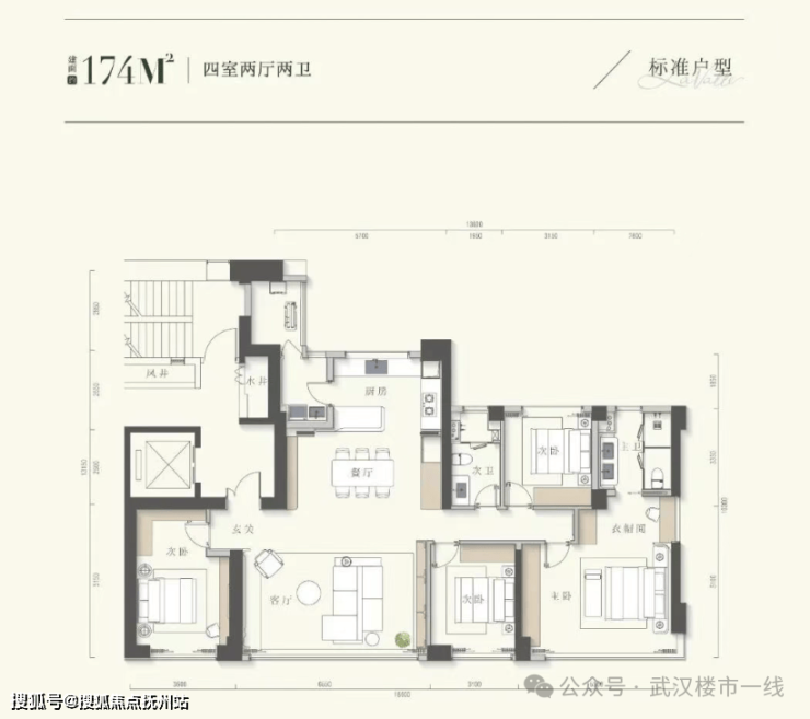 该户型是T3号楼典藏四房,同样是独立电梯前室,入户双玄关,同样是大开间、短进深的四开间朝南,无论是南向采光、景观视野还是通透性,都堪称“上品”。