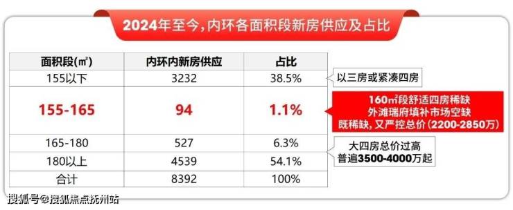 而在总价层面,外滩瑞府也是当下千载难逢的2200-2850万一步到位4房的机会。2024年至今,内环的四房供应起步面积段大约在180㎡,180㎡以上的四房供应占比55%,总价高昂,普遍在3500-4000万左右。