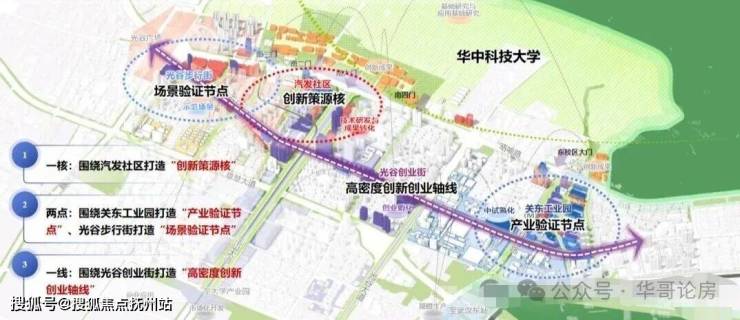 方案规划“一核两点一线”空间布局,即以汽发社区为“创新策源核”,以关东工业园为“产业验证节点”,以光谷步行街为“场景验证节点”,以光谷创业街为“高密度创新创业轴线”。