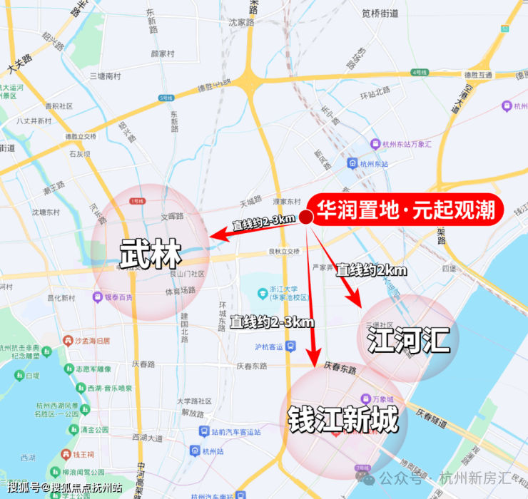 杭州华润置地·元起观潮择址城市精粹之上——上城区安琪儿板块,毗邻杭州第一中心武林和第二中心钱新,北近京杭运河,土地价值高,环境优美,交通便利,是杭州新城核心组成部分。项目所在大区域为城市核心区,周边路网发达,城市界面较好,场地周边已规划幼儿园及小学,配套齐全,地块北侧200M为京杭运河,为场地赋能。