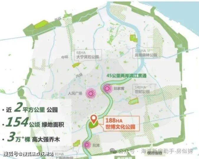 世博文化公园的面积更大,共计近2平方公里,相当于25个人民公园,是中心城区最大的公园绿地。另外,世博文化公园旁边还有面积达2.5平方公里的黄浦江水域,公园可与这一广阔水域相融。