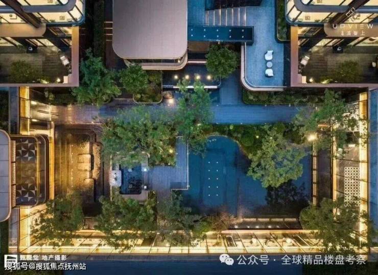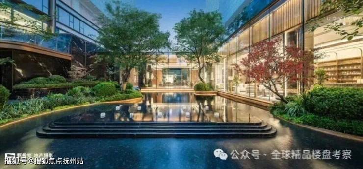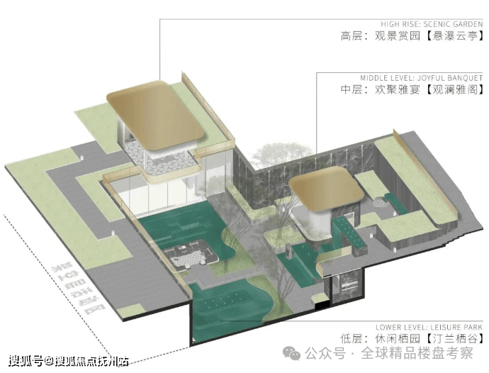 约 800 m的下沉式核心景观,引入世界收藏级建筑-一赖特流水别墅的「有机建筑理念」,通过巧妙的高差处理,形成高、中、低三重递进式景观层次,实现建筑与瀑布、植被的共生。