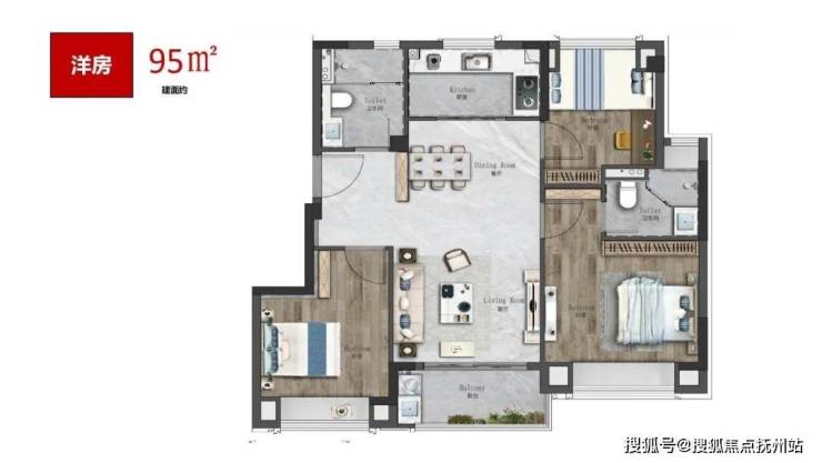 厨房、餐厅、客厅、阳台一体化,节省了过道面积,也让公区视野更开阔。