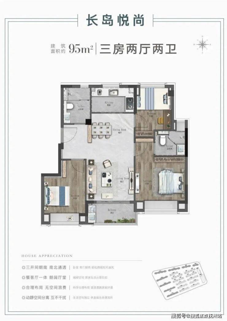 该户型做到了三开间朝南+南北通透,采光和通风效果优质。