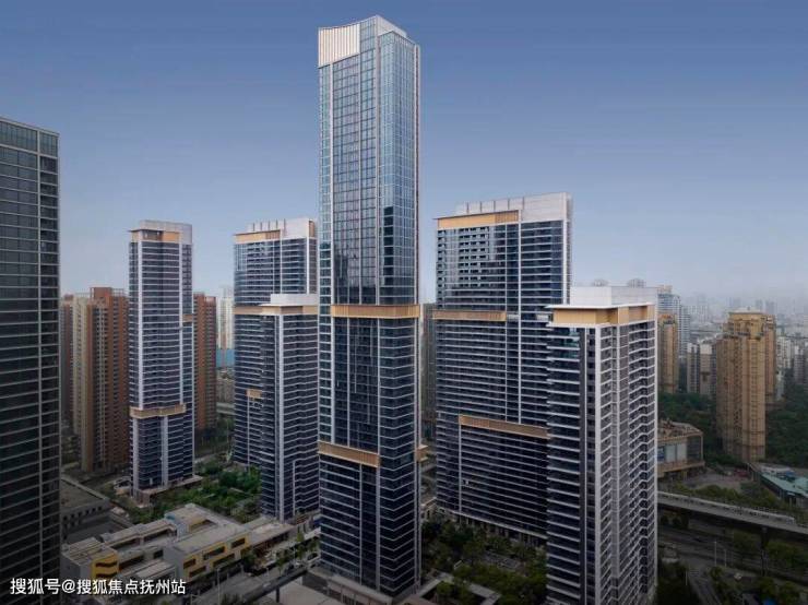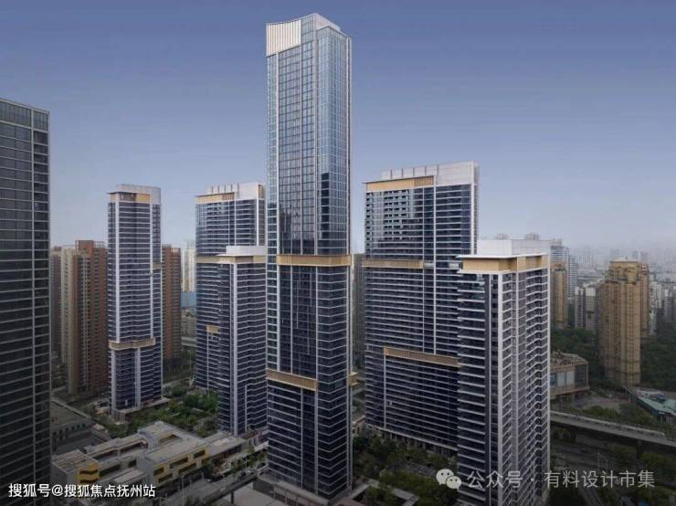 外立面运用国际视野和审美,设置竖向型材线条加强挺拔感,展现长江波光浩荡质感,以大江大河气韵,致敬土地文化。搭配“风帆”塔冠造型,融合鎏金腰线瑞字纹穿孔铝板,成为瑞府藏家身份的专属昭彰。