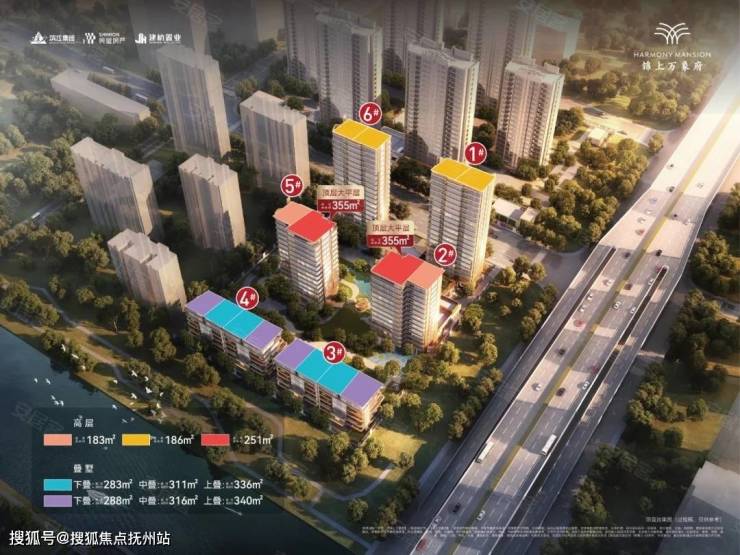 产品规划:建面约283-340㎡一线运河叠墅 建面约183-355㎡领翼高层