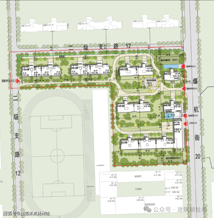 小区的人行、车行出入口均位于东侧煤机街上,西侧仅有一个消防出入口。1#、3#、5#、7#为装配式建筑。同样也是用地比较小,留给景观的空间的不多。