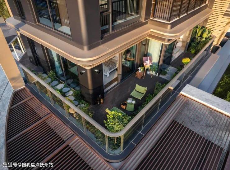 · L型露台——当你身在这个270°环形巨幕庭院,让你恍惚间有种身在双拼别墅庭院的错觉,在客厅、在主卧,眼前都是那片绿意盎然的庭院。只有抬头与宁波中心大厦对望,才把你拉回四代宅。