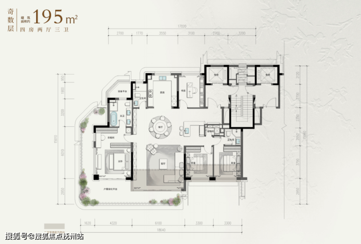 以建筑面积约195平样板房(奇数层)为例,一目了然: