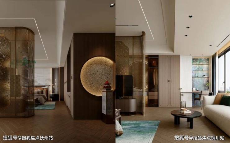 随后便是开放式会客厅与家庭工作室的组合,全功能空间多元化应用,无论是接待来客还是家庭悦享均可,充分发挥大格局所带来的功能并行性优势,让松弛感充盈居家生活情境。