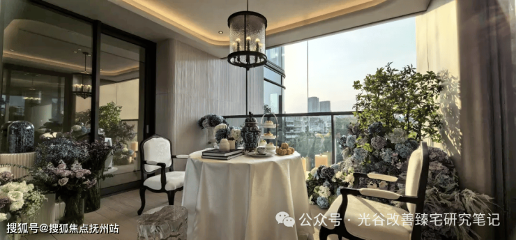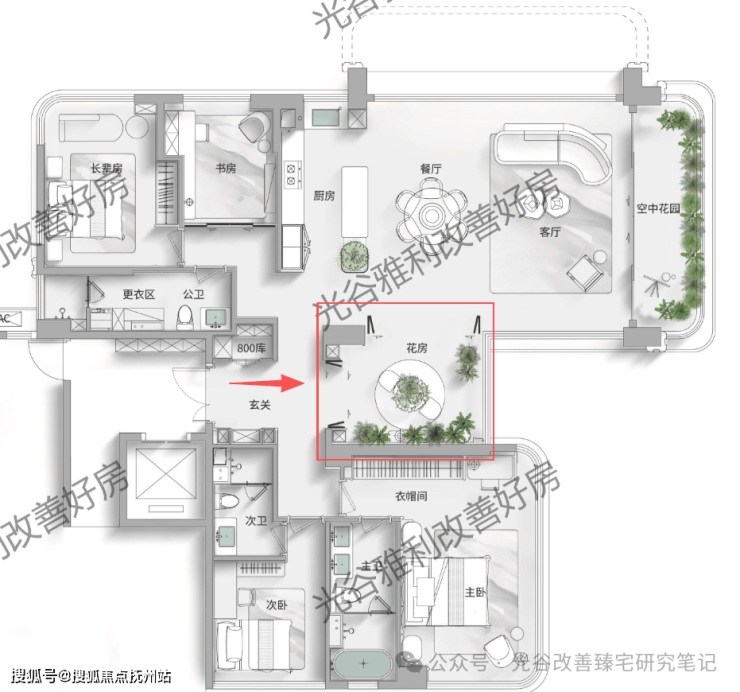 这个「空中院馆」,可不是普通的阳台。除了有开门见景,玄关照壁的作用;还起着枢纽链接作用:与家庭LDK厅相接,又与主卧区直接相连,形成了一条串联室内外主要功能的居家洄游动线。(万科装修示意图把这里做了一个只链接客厅的开放式花房,不过也是一个非常惬意的生活空间)