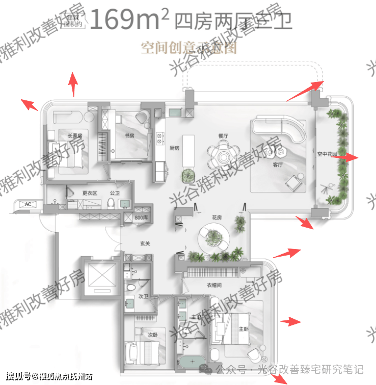 这三个元素,都是采光,景观的代名词。所以,我们可以看到客厅270度三面采光观景,主卧270度三面采光观景,甚至北向一个次卧,还可以双面观景。
