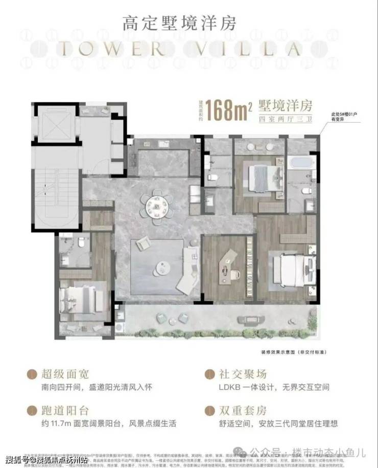 4房3卫布局,满足成长改善家庭需求;约14.9米南向大面宽,四开间朝南,LDKB一体化布局及双拐角270°采光阳台,最大化延伸空间感;南向双套房,以高实用性媲美市面上200㎡+产品;约11.7米三连大阳台更是点睛之笔,据说精装标准也是板块内的天花板。全屋智慧中枢摩根智能系统】从单元门人脸识别到七合一智能门锁,摩根智能系统串联大金中央空调、汉纳地暖、兰舍新风系统,搭配场景化灯光控制,智能窗帘控制。东吴序以科技为基础,实现零接待同行,让归家动线成为流畅的归家仪式。【全屋一线国际品牌奢装】SMEG油烟机、三眼燃气灶、蒸烤一体、13件套洗碗套件,打造意大利顶级家电品牌;杜拉维特浴缸、马桶与高仪五金,让卫浴空间成为美学展场;定制美妆冰箱镜柜,则于细节处实现功能与艺术的兼顾。