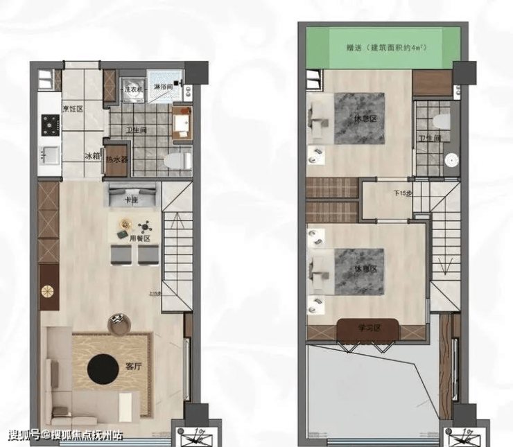 59㎡loft公寓,买一层得两层,赠送率高。动静分区,楼下活动区域、楼上休息区域互不打扰。一楼为公共区域区,二楼为休息区域。