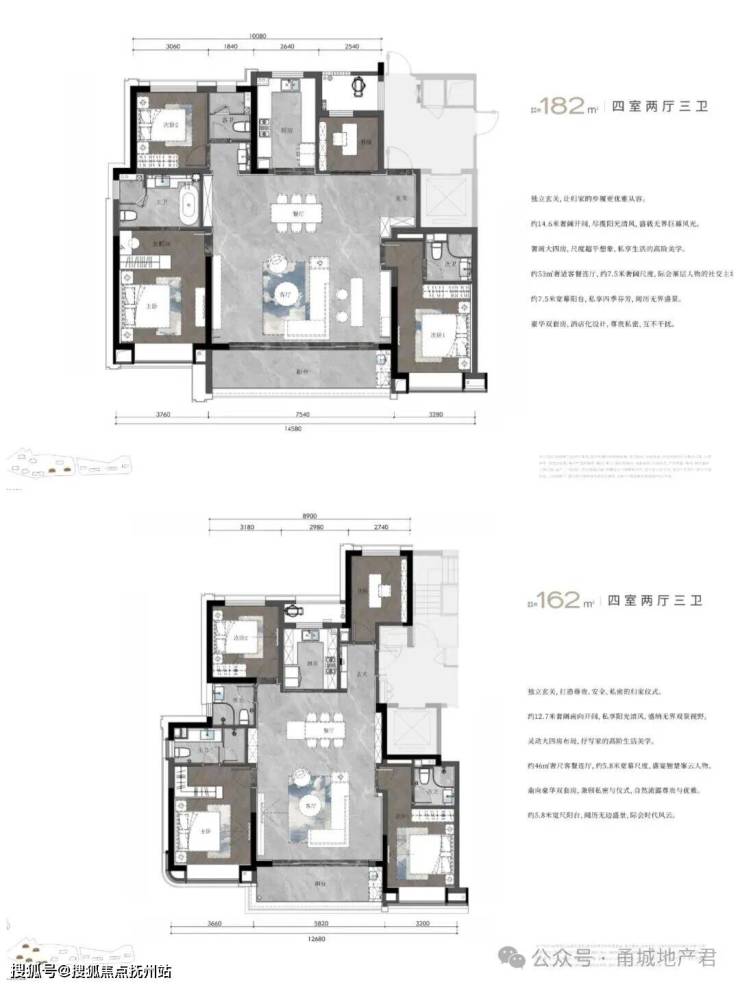 这个5个户型整体都非常相似,都是三开间朝南设计,区别在于客厅、房间的面宽在不断变大。但对于162平以上来说,这几个户型就非常一般了。