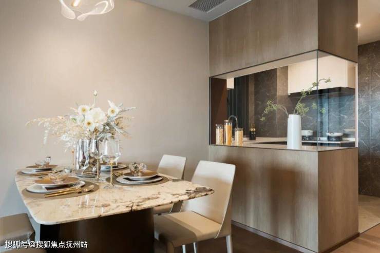 而在江城府,用玻璃栏板代替移门,让通透的视觉效果放大,更让厨房与客餐厅有了完美的无界感。