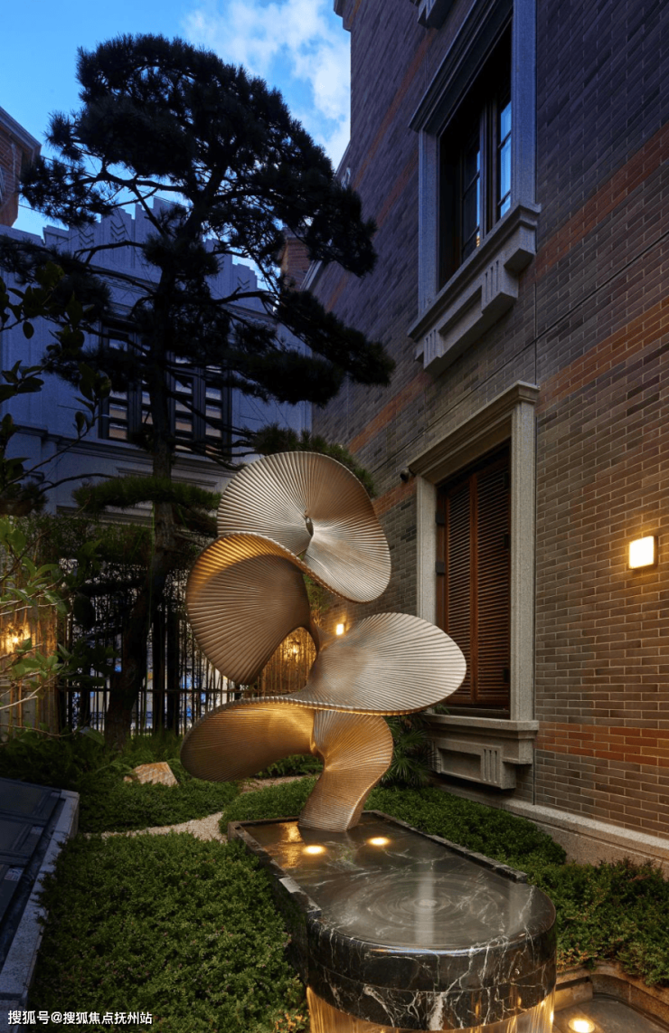 地面延续酒店式落客区海棠纹拼花镶钻,铁打纹工艺,其间还有老石板,青石板,中国黑老石皮,柏坡黄的石皮等原石原面铺装,老石皮从大料里取出,数量少而贵,由此也可看出保利·永兴里在别墅打造上是真舍得,也是真高级。