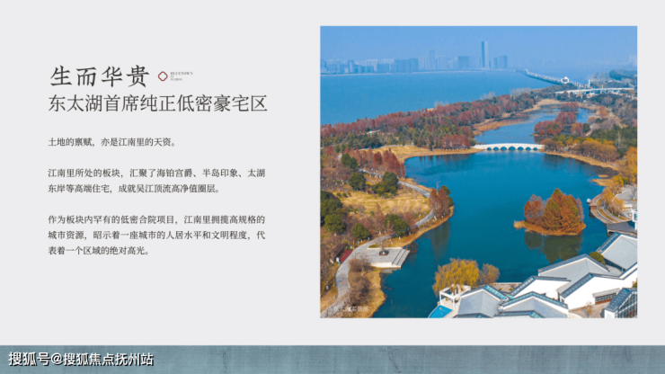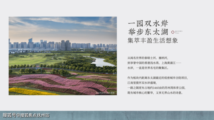 项目西侧毗邻东太湖百里风光带,尽揽万顷太湖盛景与湾区繁华。约1200亩东太湖生态园环绕,尽享纯天然的生态氧吧。作为稀缺的城市自然资源,不可复制,无法再生。
