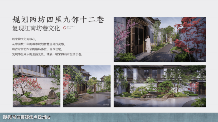 江南里师法《千里江山图》、《溪山行旅图》、《四景山水图》等经典宋画布局,敬呈登堂、庭院、游园、里坊、归家五进礼序,打造吴江首座约240㎡下沉式庭院,规划“两坊四里九邻十二巷”格局,铺展可赏、可游、可憩的诗画长卷。