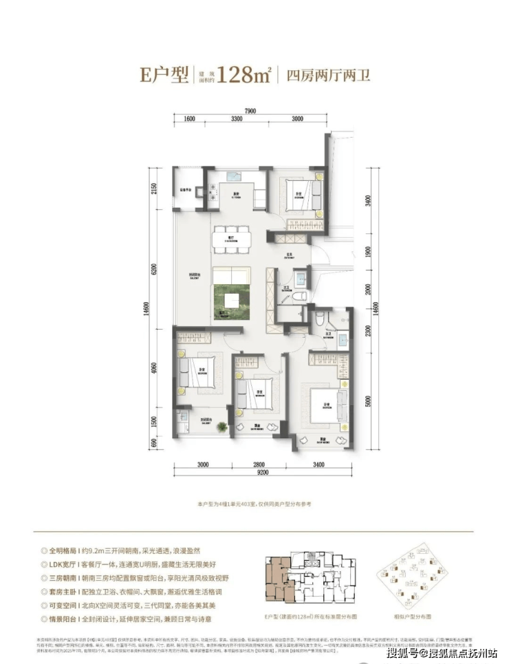 128方户型:四房两厅两卫,独立玄关,横厅边套,三卧朝南,生活阳台+休闲阳台(全包),近16米采光面