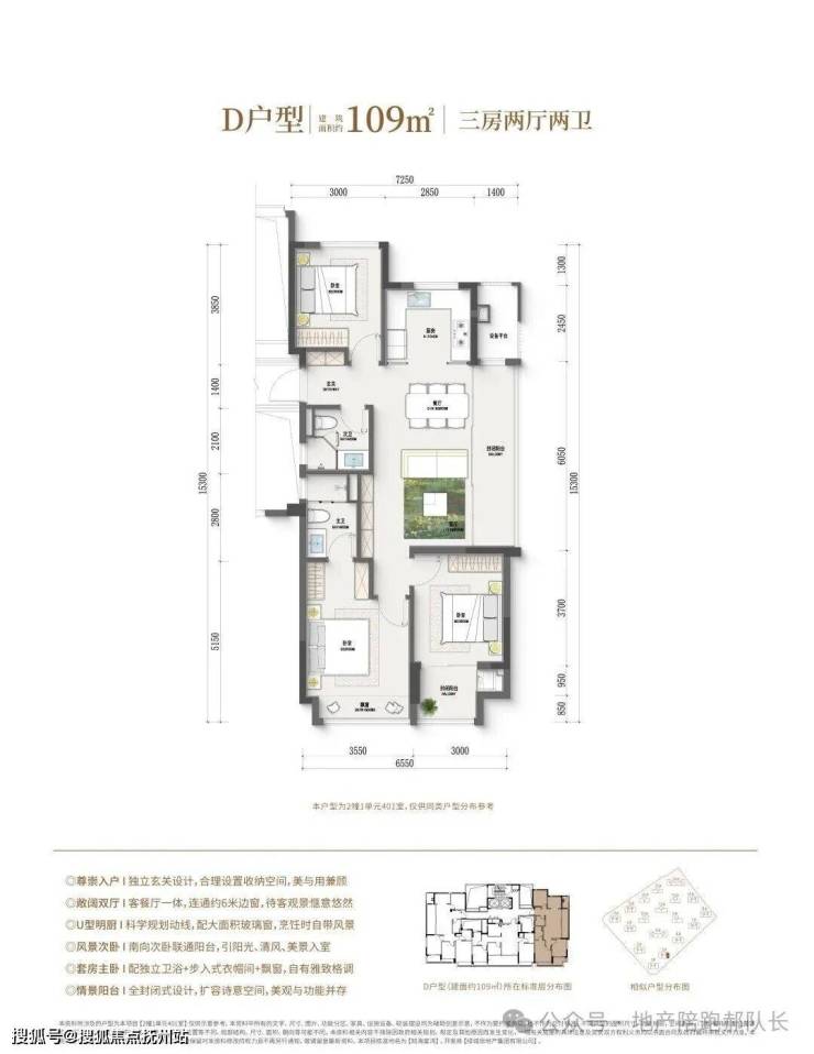 109平米户型:尊享三室两厅双卫设计,配备独立玄关,宽敞横厅边套,功能分区明确。配备生活阳台与休闲阳台(全包),实现13米超长采光,打造舒适明亮的生活空间。