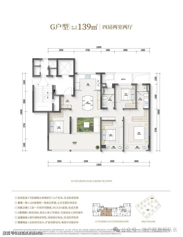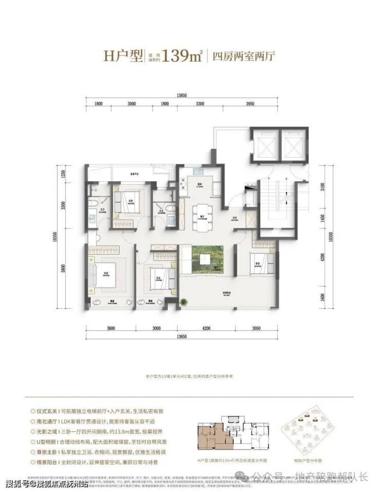 139平方米户型:两种户型一是四室两厅双卫,设有独立玄关,宽敞横厅边套设计,三室朝南,配备全包式双独立阳台。二是四室两厅双卫,配备独立玄关,南北通风顺畅,四开间向南,配备全包式双独立阳台。