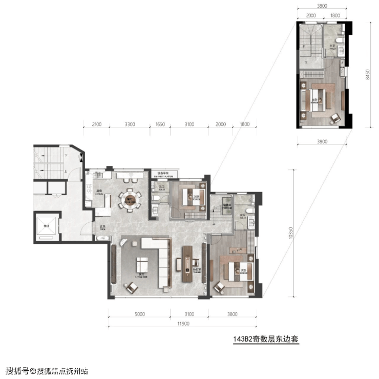 建面约143㎡错跃奇数层东边套户型图过程稿示意