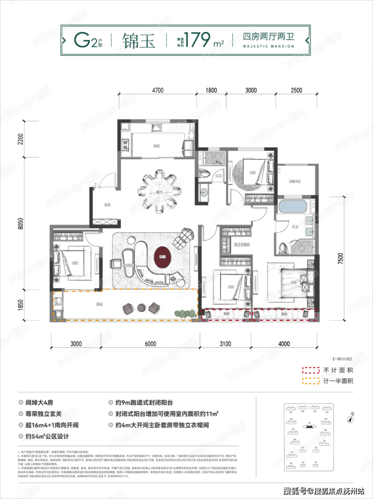 一层4户,户型建面约175㎡、179㎡,销售电话:186-6709-7609√√【微信同号】阔绰大四房、四开间朝南、超16m面宽、约54㎡LDKB一体化超大社交空间,户型设计满足全家人生活需求。