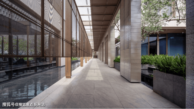 归家路上漫步于水榭光廊,阳光透过格栅在地上形成斑驳的光影,与单侧的水景波动的涟漪互动,让人在潜移默化中,获得身心的舒缓。