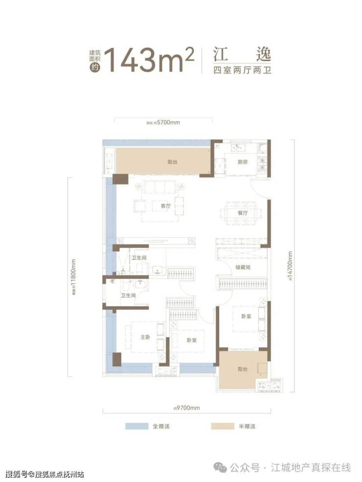 建面约143㎡户型,270°采光U型观江+高比例阳台赠送+“3+1”格局动静分区+约30㎡主卧套房。