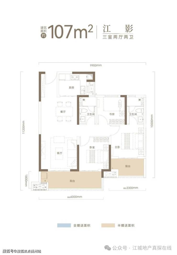 建面约107㎡户型,约10米南向观景阳台+约20㎡主卧套房+全明双卫。