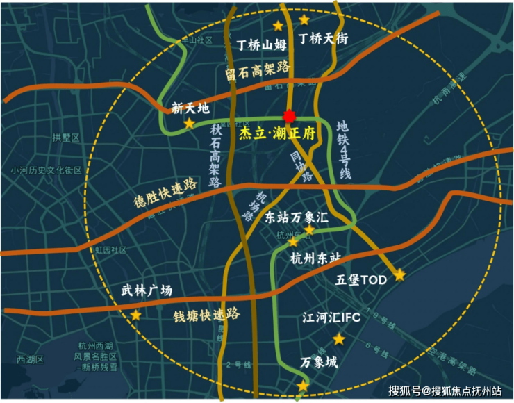 从潮正府出发,拉一条直线至江河汇,大致只有5km,地铁4号线出发,换乘6号线只需七站即可抵达。到钱江新城核心站点——钱江路,地铁也只需八站,而且还无需换乘,4号线直达,如果换算成时间,那么地铁大致20分钟。