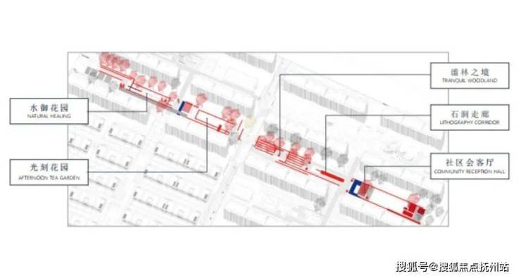 归家活力轴线:打破传统的轴线布局,约300米季相花园轴贯穿东西,约200米的邻里街区轴连通南北。以错落跃动的五线谱形式展开,连接社区活力纽带,以组合错位的方式形成邻里花园。