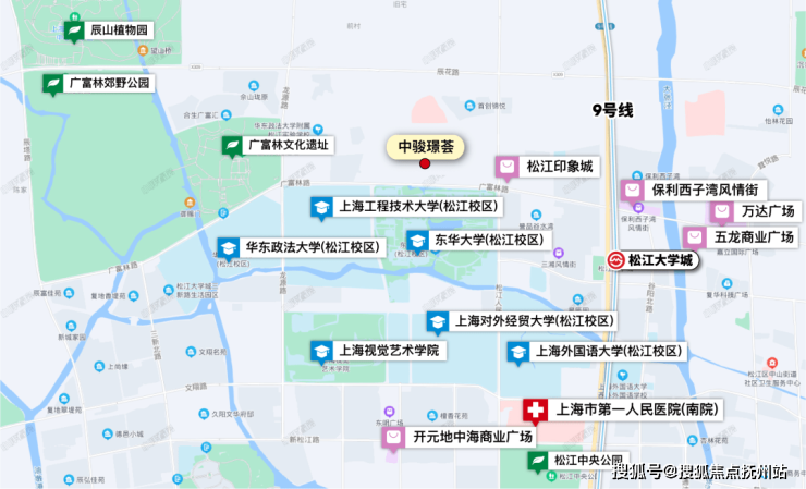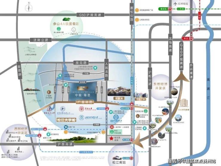 城市资源从东到西一字排开,有万达广场、印象城、东华大学(松江校区)、华东政法大学(松江校区)、广富林文化遗址、广富林郊野公园等。