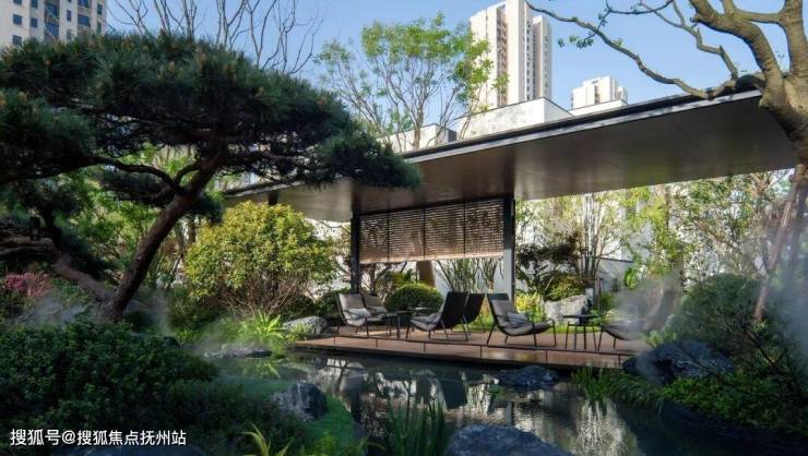 “醉森泉”中心庭院,取醴泉之境,打造林荫水庭空间。 园中新中式廊亭采用超薄盖顶,通透的立面让景观更好的渗入,庭前水流潺潺、石瀑清鸣,于都市山林中造自然野趣,感受隐逸的诗意生活。