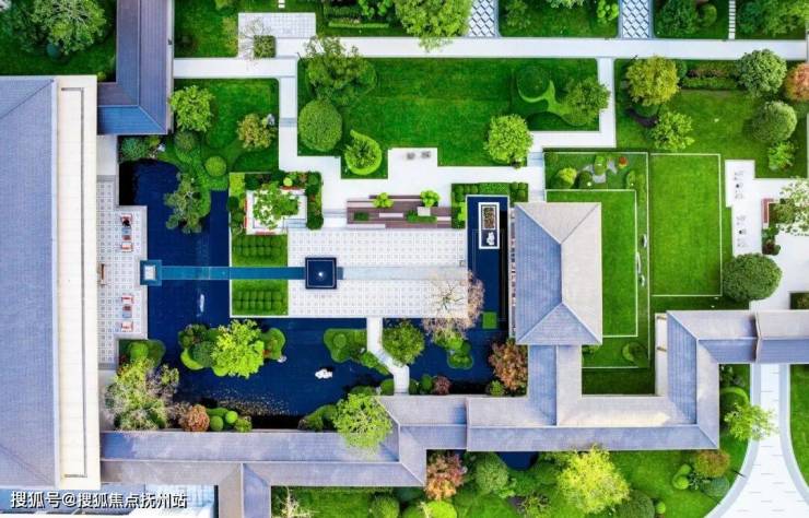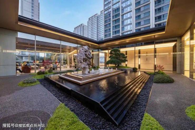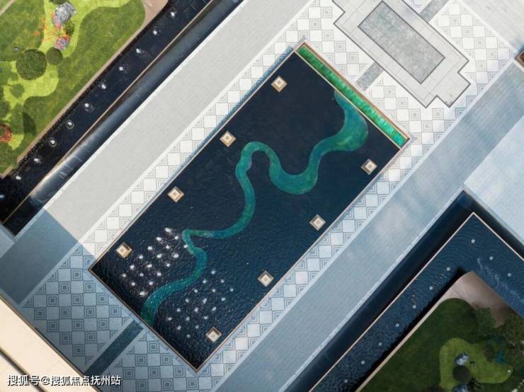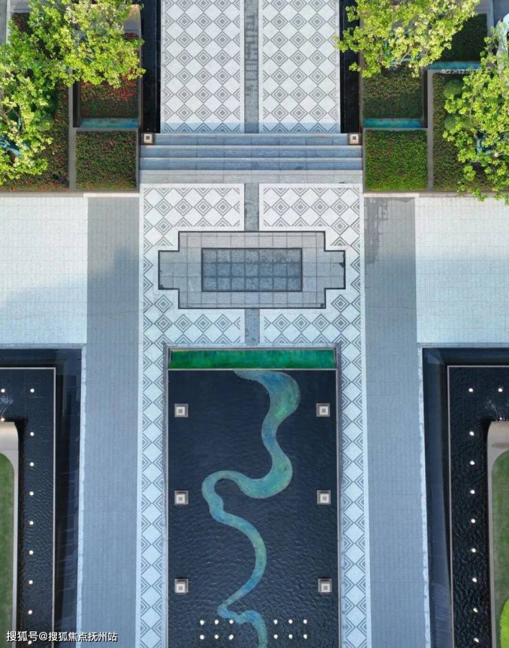 两侧跌水景如湖舟并进,气势昂然。船头碧色琉璃似翠玉浮波,引人注目。行至其间,静水潺湲若礼乐轻奏,似漫步于湖中“桥”。步移景升,沉浸归家之仪自此而始。