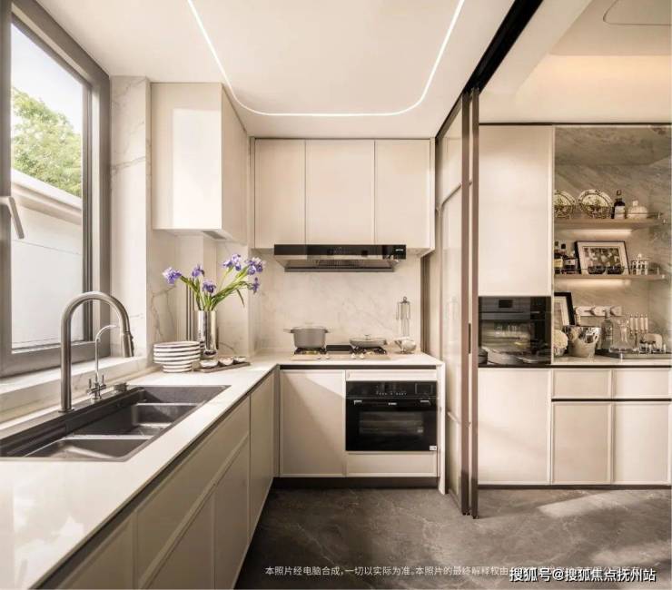 客厅、厨房地面采用希尔顿酒店御用的简一大理石连纹密封砖,约900*1800超大尺寸,堪称地砖界天花板;还有超薄悬浮吊顶设计,搭配皮革背景墙,空间格局不彰自显。