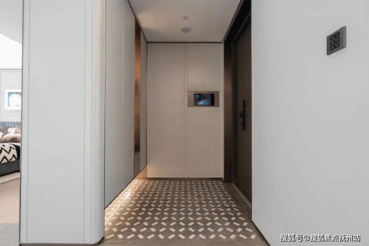 不仅配置给力,设计也独具美学质感,墙面由石材镶嵌意大利毕加索奢石,地面为大理石水刀海派拼花,还没走入家门,品质感已经拉满!同时,入户门为定制浮雕铸铝装甲子母门,门上配有飞利浦六合一智能门锁。