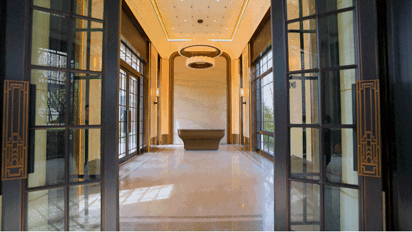 踏入挑高大堂,巴西银河白奢石与土耳其米黄系大理石的组合,构建色彩递进与质感对比的视觉层次,通过弱化棱角与流动线条,将传统直角的冷硬感转化为温润的包容性。从视觉到触觉的全感官体验设计,将空间转化为承载记忆与身份认同的载体。