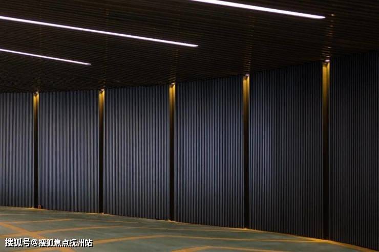 如果是开车归家,从入口车道缓缓下坡,第一眼就感受到宽敞明亮。两旁不是普通的涂漆墙面,而是古铜色金属格栅,就连车道吊顶也做了浅灰色的格栅造型,非常具有质感,回家的尊贵感油然而生。