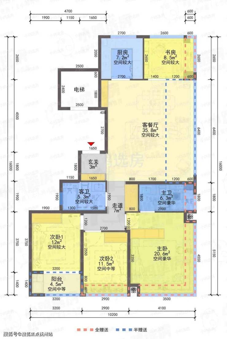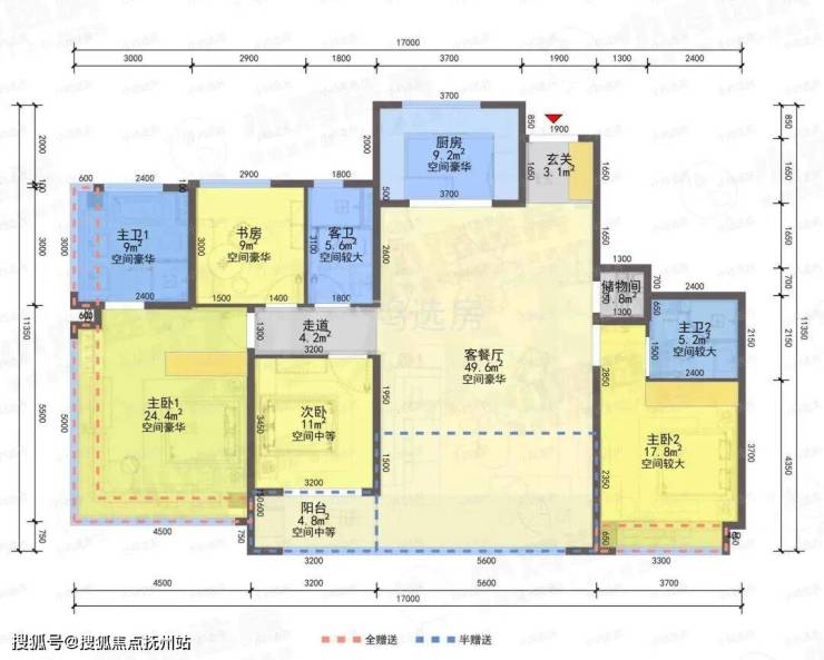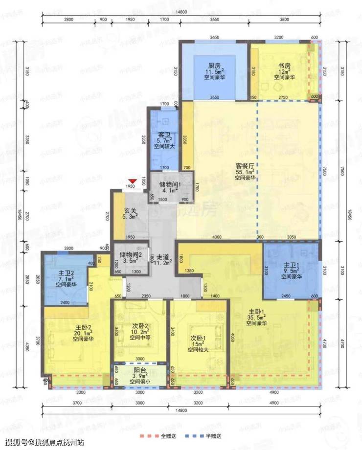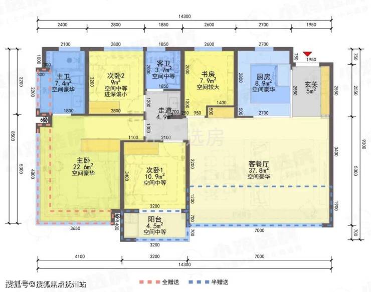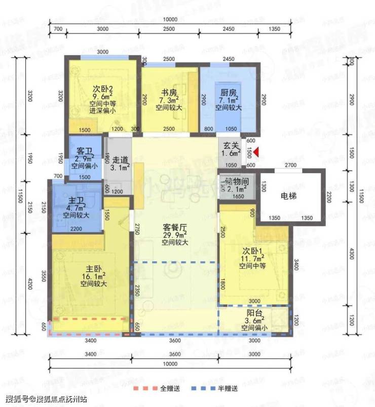 ❶建筑面积约110㎡户型,4房2厅2卫,含赠送得房率约91%。