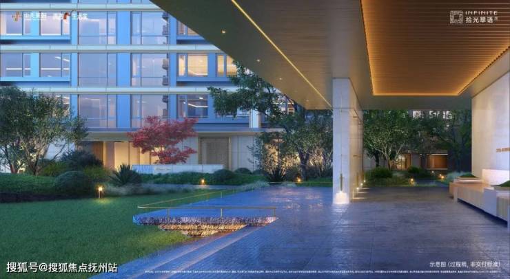 “一轴四境”的景观格局,将大堂、水院、花园、草坪等一一串联,绿洲与水系相伴,归家之路如桃源之境。板块第一个半封闭式架空层,兼容瑜伽、健身、亲子、阅读等功能,