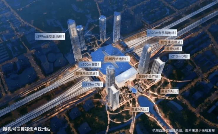 高度约399.8米“金钥匙”综合体,建成时将成为杭州第一高楼;高度约320米的“金手指”综合体建成时将成为杭州第二高楼,目前四幢高楼皆已突破200米大关,CD塔楼已封顶;