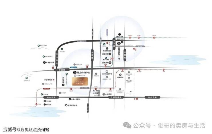 (1)立体交通——中环、南环快速路;地铁1号线、地铁5号线(约500m)在侧;约1km内覆盖12个公交车站,便捷交通体系,瞬时链接苏州全城。