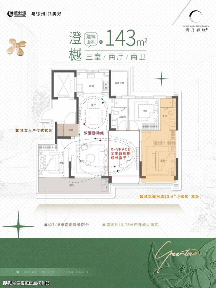 建面约143㎡3+1室户型:独立玄关、约13.75米四开间大面宽,南向约7.15米超长阳台,采光超棒,宽敞明亮不压抑;“小家化”套房主卧,品质生活一步到“卧”;X-SPACE百变空间,卧室、书房、健身房……随你喜欢,随心改造。